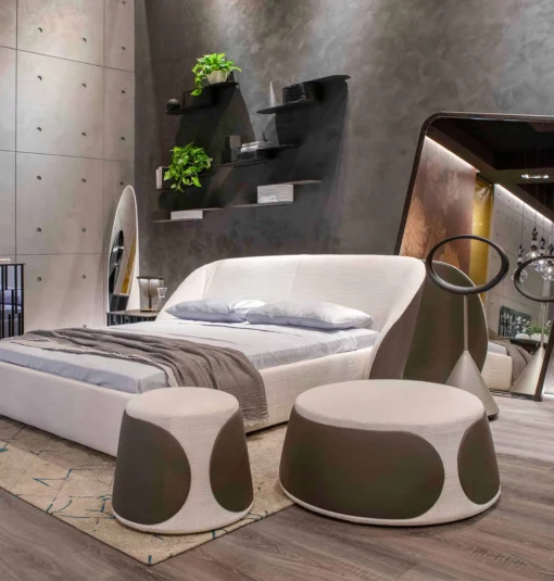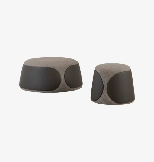 Oblé taburetky s čistým designem, které nepůsobí rušivě, ale přirozeně zapadnou do interiéru. Kombinace látky a hladkých ploch vytváří příjemný kontrast, který nepůsobí okázale, ale zaujme.