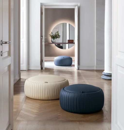 Díky svému tvaru a zpracování působí jako čistý designový prvek. Typické ručně dělané plisování vytváří pravidelnou strukturu, která taburetce dodává hloubku a jemnou dynamiku.